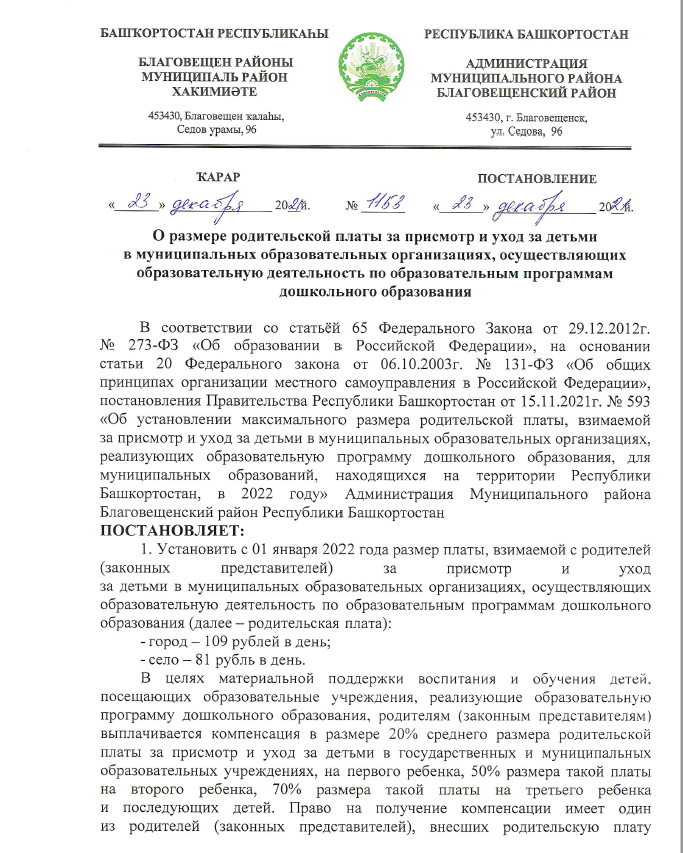 Уведомляем Вас, что с 01 января 2022 года размер платы, взимаемой с родителей (законных представителей) за присмотр и уход за детьми в муниципальных образовательных организациях, осуществляющих образовательную деятельность по образовательным программам дошкольного образования в городе составит 109 рублей в день